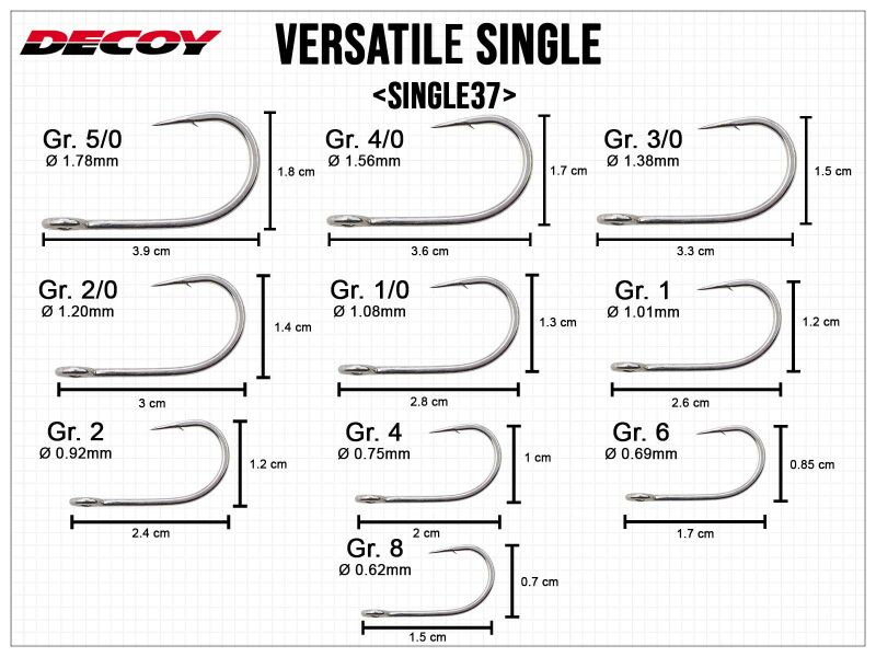 Decoy Versatile Single 37 is a robust single hook that maintains its shape even in the smallest sizes. Designed with a Japanese grip, it's perfect for upgrading spoons, as an additional hook on spinnerbaits, for use with flexible jig heads, and more. The extra-large eye (Smart Eye) ensures smooth movement on the split ring and makes installation easier with its flattened side. The Versatile Single 37 is resistant to saltwater corrosion and features a small barb for easy hook penetration into fish mouths.