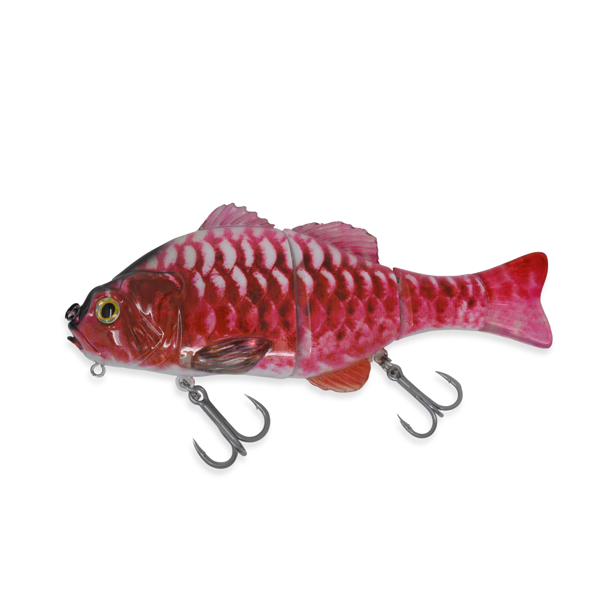 This Large jointed swimbait measures 200mm in length and weighs 147g. Constructed with a number of subtle yet innovative features. This lure is built with a swivelling line tie and swivelling hook hangers, which reduce line twist and limit a fish's ability to use the lure as leverage during a fight. At the chin it features an extra hanger that allows anglers to fine tune the sink rate with the addition of extra weight. Its pectoral fins allow this lure to dive to around 1m with a smooth S shaped action. This lure can be jerked on slack line to turn this bait 180 Degrees to mimic a wounder bait fish