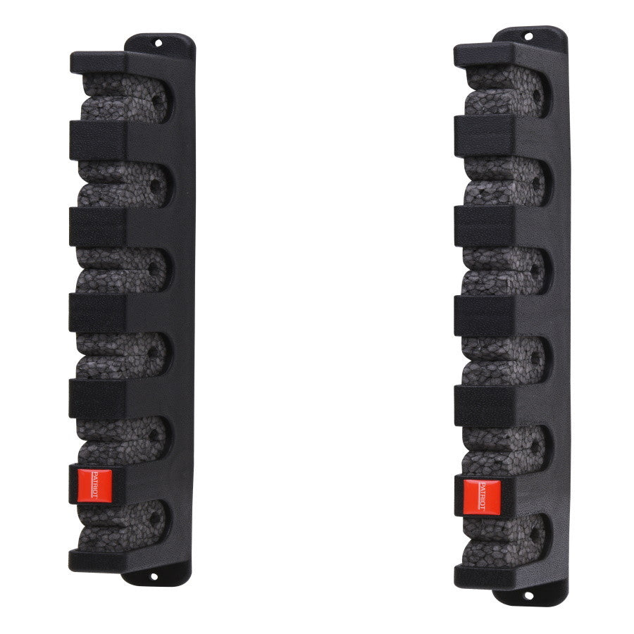 Patriot storage rack that can accommodate up to six fishing rods. This rack is perfect for storing and carrying various types of rods, whether it's in a boat, van, garage, or warehouse. The rack is constructed with durable plastic material, which makes it both sturdy and lightweight. The soft and flexible foam padding inside the rack ensures that your fishing rods are securely held in place and won't get scratched. Additionally, the stand parts can be easily adjusted and fixed in place with screws to achieve the desired distance between each rod. The rack has a height of 35cm and provides a horizontal storage option for your six fishing rods.