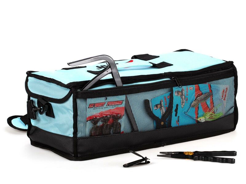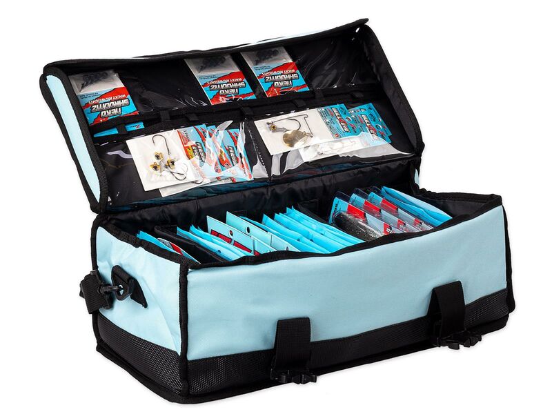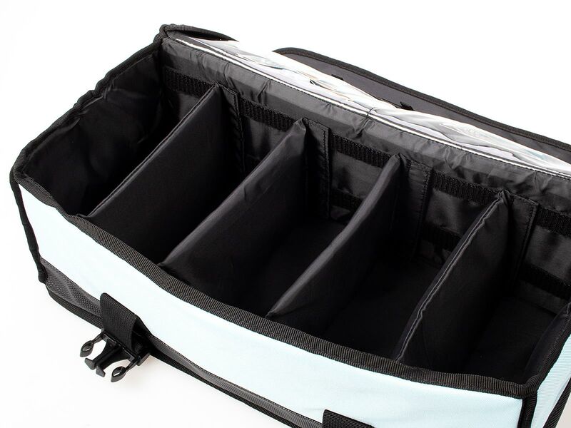 The large Bait LockerZ bag from Z-Man is made from durable, waterproof 600-denier fabric and has plenty of room for more than 50 packs of ElaZtech softbaits. It is equipped with adjustable dividers so that the packs can be neatly sorted upright. The top flap has magnetic closures and prevents the lid from popping open. Clear inner compartments with Velcro fasteners provide additional storage space for jigs, hooks and bait. The exterior mesh pocket easily accommodates larger items such as tools and leader spools. A sturdy, rubberized bottom prevents slippage on the deck and keeps the contents dry. For easy transport, the Bait LockerZ tadche has a nylon handle and shoulder strap. In addition, the bag does not contain any metal parts that could rust.