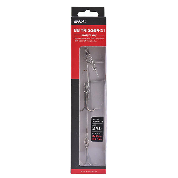 BKK's BB Trigger-21 Stinger Rig, designed in collaboration with BlackBay Lodge, is the ultimate choice for big soft baits. Tested extensively by catching numerous big Irish pike, this BB Trigger-21 Stinger Rig redefines the concept of its kind. It boasts a range of features including a front spring to secure the rig onto the bait, tempered stainless steel components for durability, a stiff structure that adheres perfectly to the bait profile, plastic-covered pins for a secure fit, BKK Spear-21 treble hooks for optimal penetration, stainless steel swivels to reduce torsional forces, and compatibility with the BB lead system for customizable sinking speed and pattern. Available in multiple sizes to cater to a wide range of soft baits. Add the BB lead to the rig for added stability and enhanced attractiveness during the fall. Perfect for a stop-and-go retrieve.