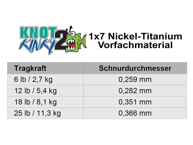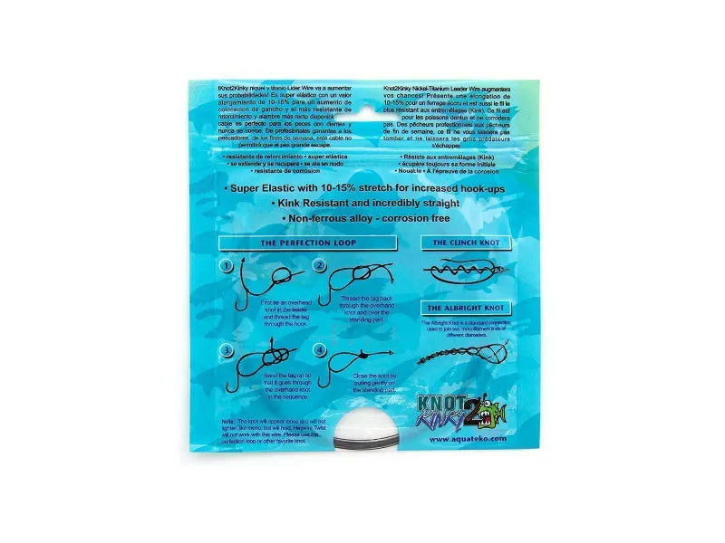The Knot 2 Kinky 1x7 titanium leader material is composed of seven threads that are resistant to corrosion and provide a flexible leader. Additionally, the material can stretch up to 10-15% under load and then return to its original shape. Unlike traditional steel leaders, the Knot 2 Kinky material maintains its straight form, avoiding the need for replacement after a tough fight. It is also easy to work with, allowing for simple knot tying and the use of crimp sleeves. Recommended knots include the Albright knot to connect the main line and leader, and the clinch knot and Perfection Loop to attach hooks or snaps. With Knot 2 Kinky nickel-titanium leader material, constantly changing leader is a thing of the past.
