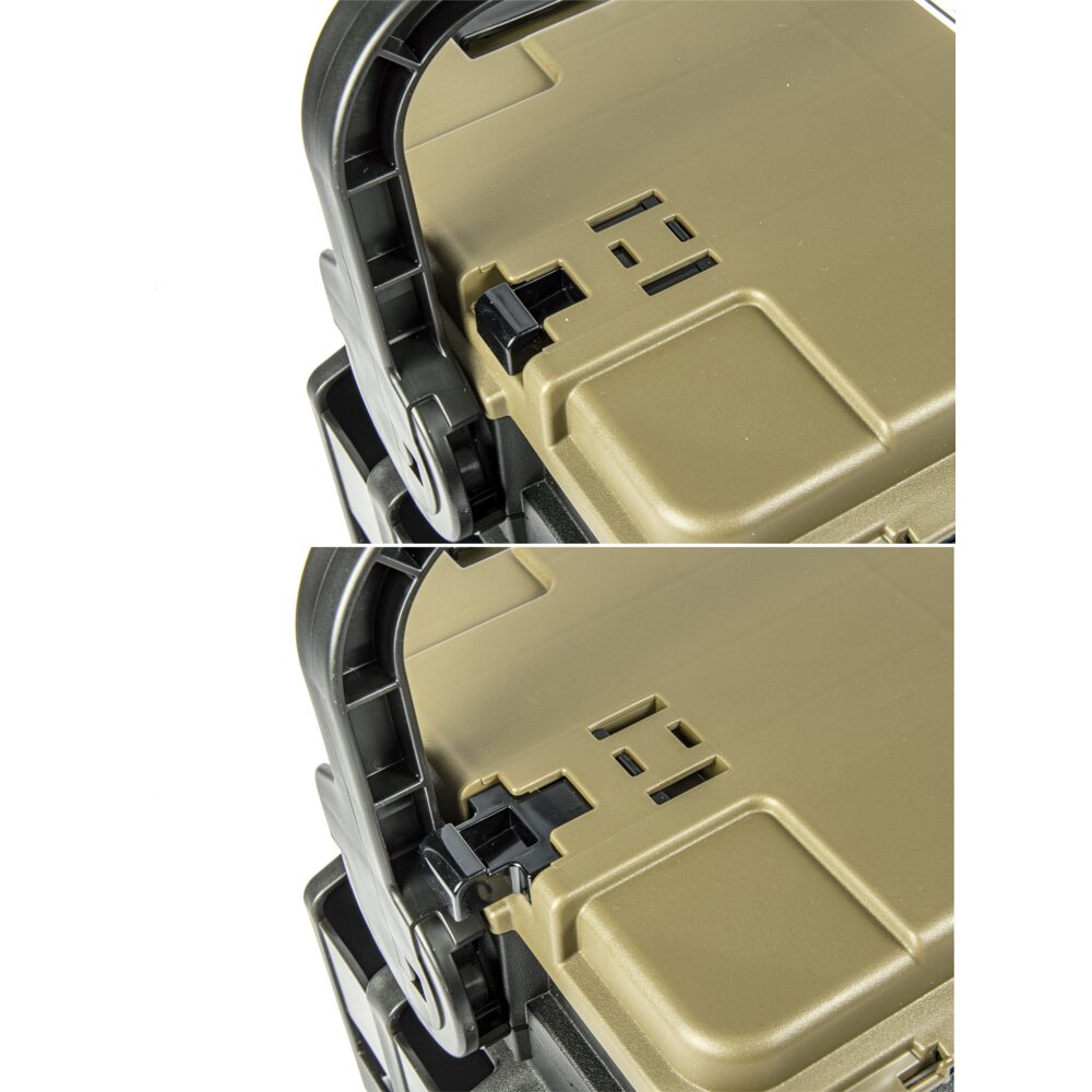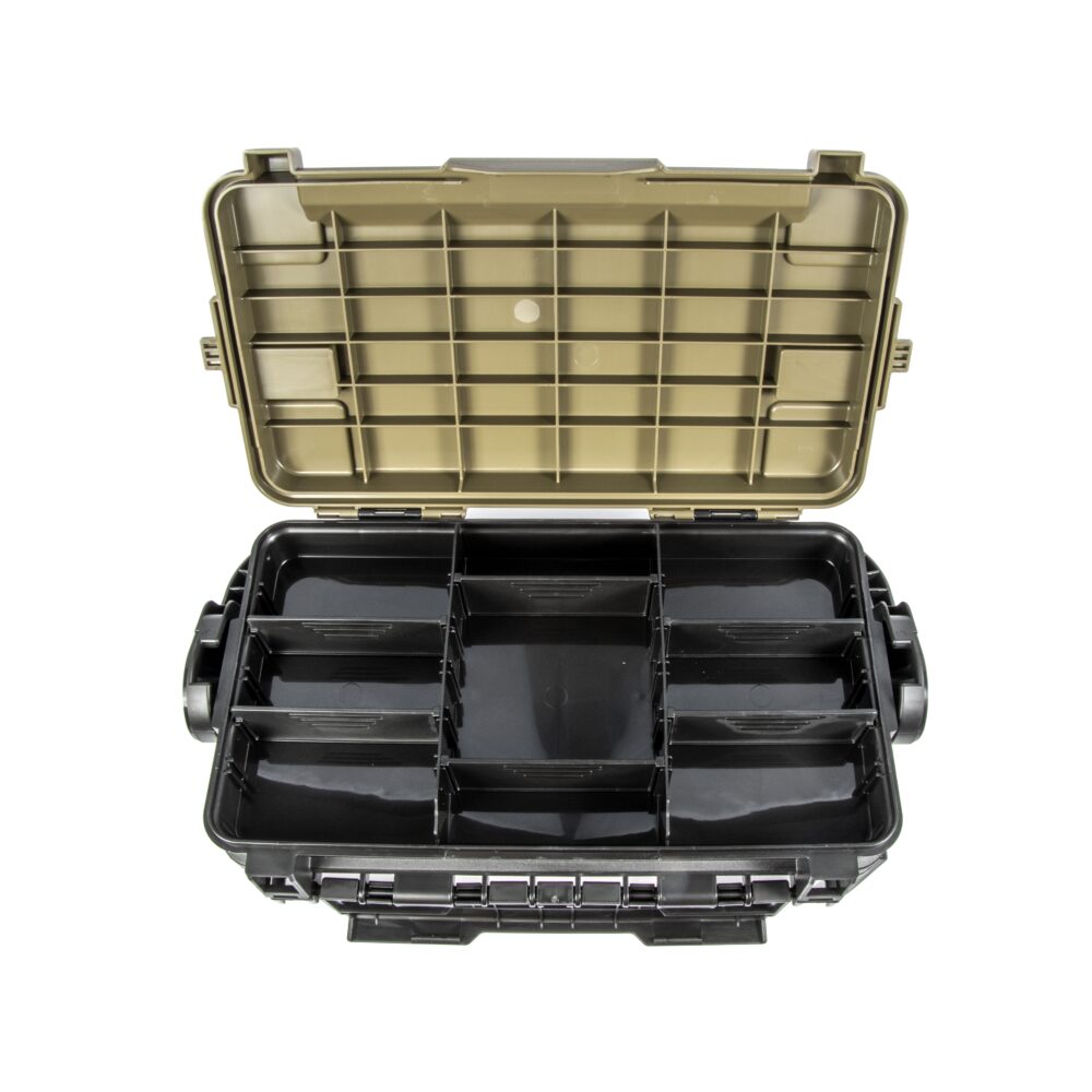 Meiho 7070N-B is an advanced tackle box featuring an aggressive compartmentalization and design. Its innovative handle fixation allows it to be mounted in a vertical position with ease. Constructed from a high-strength, impact-resistant plastic, the box features an upper compartment with 3 smaller subsections and 6 interchangeable walls, as well as a bottom compartment with 2 adjustable partitions. Equipped with rod holders (Meiho Rod Stand BM) and a side pocket (Meiho Side Pocket), the tackle box is an ideal storage container for trout fishing equipment. Dimensions: 43.4 x 23.3 x 28 cm.