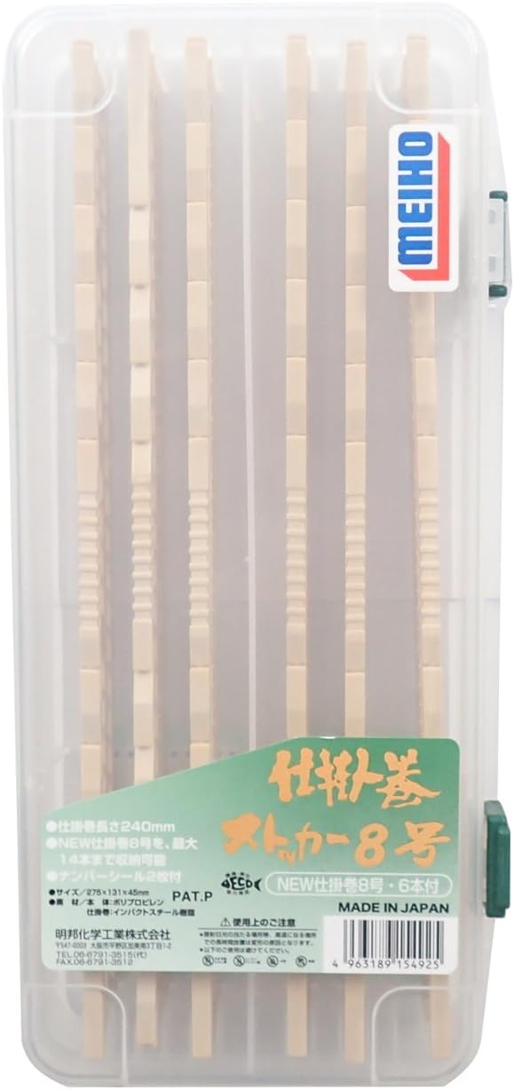 MEIHO Winding Stocker 8 box. Size: 275 × 131 × 45 mm Keep your fishing equipment organized and safe with the MEIHO Winding Stocker 8 box. Its compact size of 275 × 131 × 45 mm makes it easy to store and transport. With its durable construction, your gear will be protected from damage and wear and tear. Stay organized and ready for your next fishing trip with the MEIHO Winding Stocker 8 box.