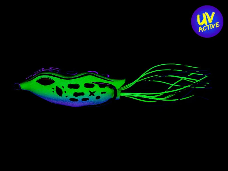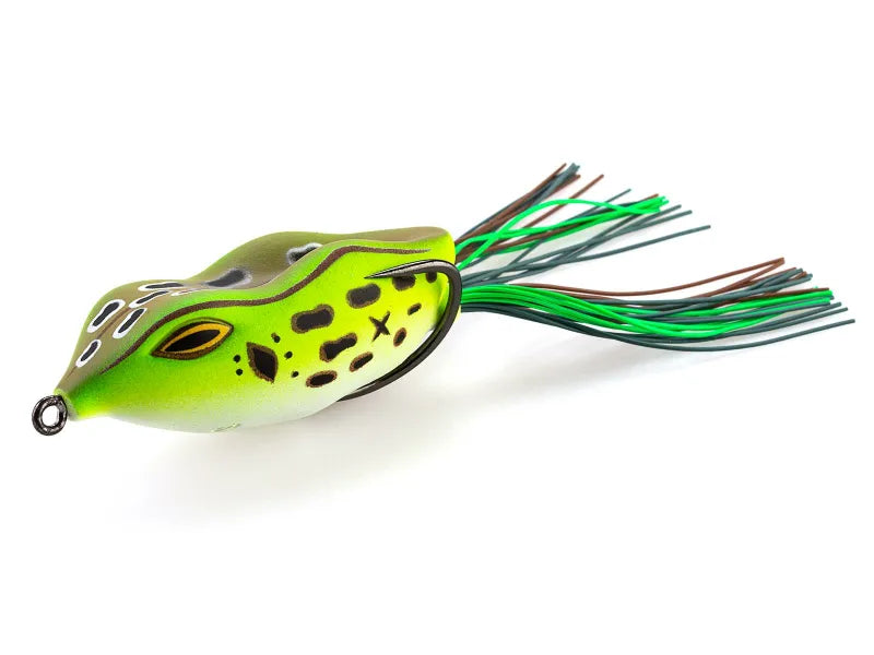 NORIES NF60 FROG, designed by Norio Tanabe, aims to create a topwater frog that lands quietly on the water, has good hooking capabilities and running characteristics, and avoids snagging. This is achieved through two strategically placed weights and a flexible cover that releases the hook upon a bite. Its location in the water leaves a trail of bubbles and splashing noises, attracting even deeper perch or pike.
