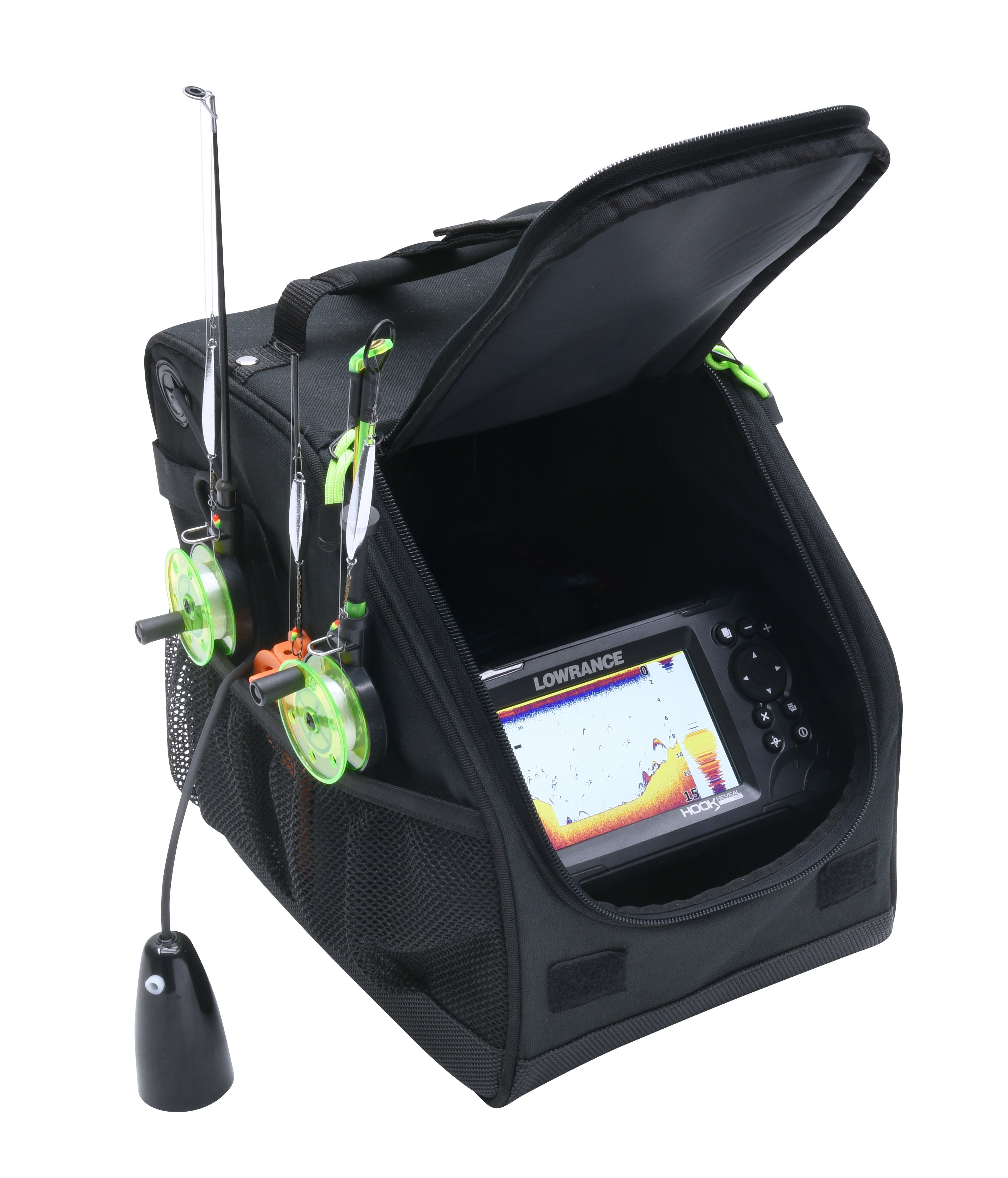 This Patriot sonar bag is perfect for 4-5" devices, fitting all brands and providing practical protection for your screen, transducer, battery, charger, and power cords. The bag has a sturdy strap, waterproof bottom, and adjustable cover to reduce reflections and protect against rain and snow. It also features website pockets for ice fishing gear and an adjustable sensor cable length.