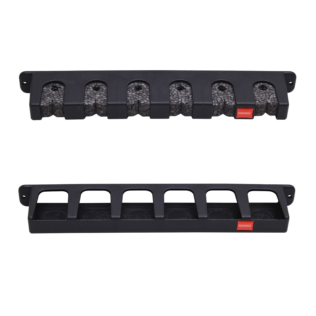 Patriot storage rack that can accommodate up to six fishing rods. This rack is perfect for storing and carrying various types of rods, whether it's in a boat, van, garage, or warehouse. The rack is constructed with durable plastic material, which makes it both sturdy and lightweight. The soft and flexible foam padding inside the rack ensures that your fishing rods are securely held in place and won't get scratched. Additionally, the stand parts can be easily adjusted and fixed in place with screws to achieve the desired distance between each rod. The rack has a height of 35cm and provides a horizontal storage option for your six fishing rods.