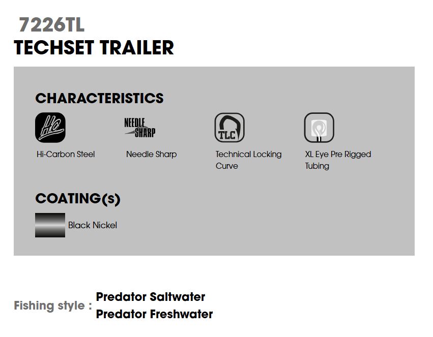 Spinnerbaits, buzzbaits, Bladed Jigs... deserve the best. The TechSet Trailer is ultra sharp thanks to its Needle Sharp™ point and especially easy to use thanks to its Cross Over Cap™: a custom silicone sock for quick rigging on every hook.