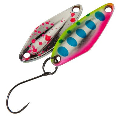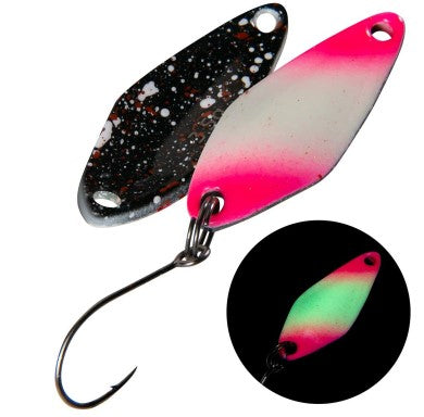 Wasp are designed for fishing with ultra-light or light rods. Equipped with an ultra-sharp, chemically sharpened single hook. The color palette of these oscillators is very diverse. The coating has a light-accumulative effect due to inclusions of particles, due to which the spinners glow in the ultraviolet. The strength of the glow depends on the tone of the color of the bait. Every trout lover will find his color of the Wasp lure.